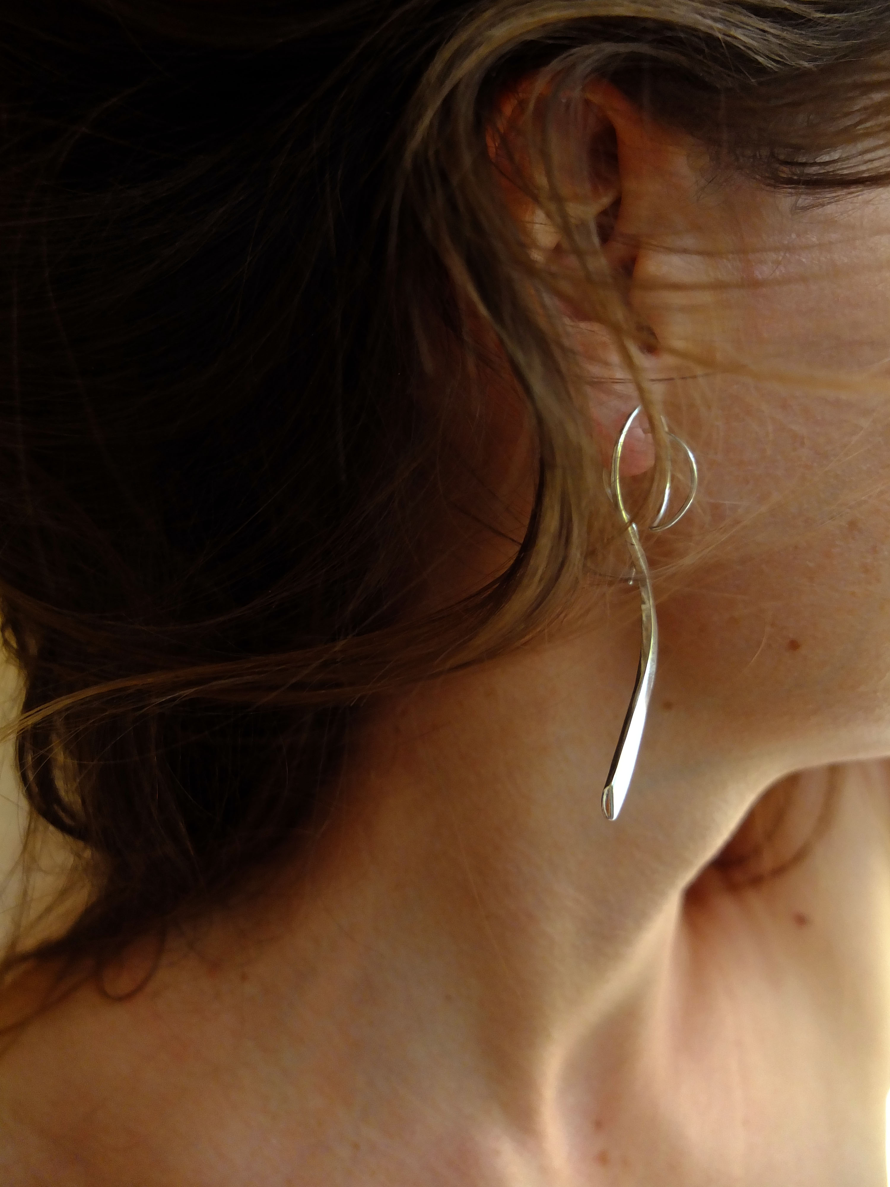 Designed as a sculpture, each earring is shaped from a single very thick silver thread that I patiently refine through the milling machine and the puling bench, which requires a lot of patience, physical strength and dexterity. It is this paradox between an intense realization process and a bewitching delicacy jewel that fascinates me. The clasp is one with the jewel since it blends into the shape of the loop.