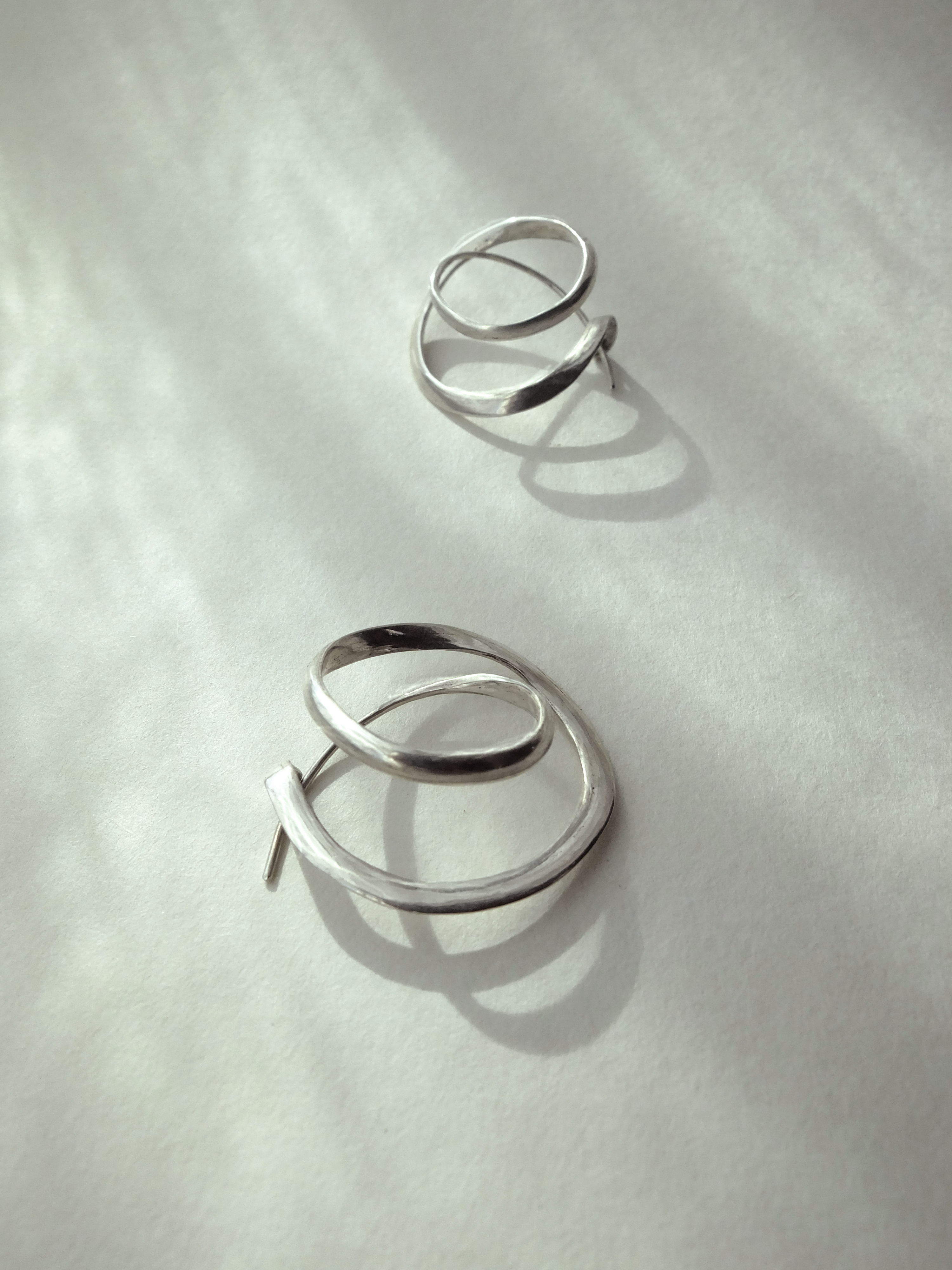 Sculptée à partir d’un même fil, patiemment tiré et laminé, issu d’un lingot d’argent massif obtenu par le recyclage d’anciens éléments en argent. Le fil varie dans son épaisseur pour démultiplier les reflets et passer avec finesse dans le lobe.